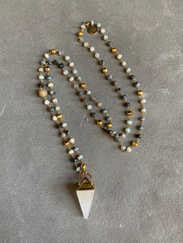 Pyramid quartz pendant on strand of dendritic opal, agate and gold beads